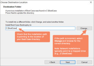 - Be sure the Destination Folder you install to is the same as the location of your existing Best Case install. For example, if you are running Best Case over a network, it may be Z:\BestCase or \\servername\BestCase. If the destination differs, select Change to browse to the existing install folder.